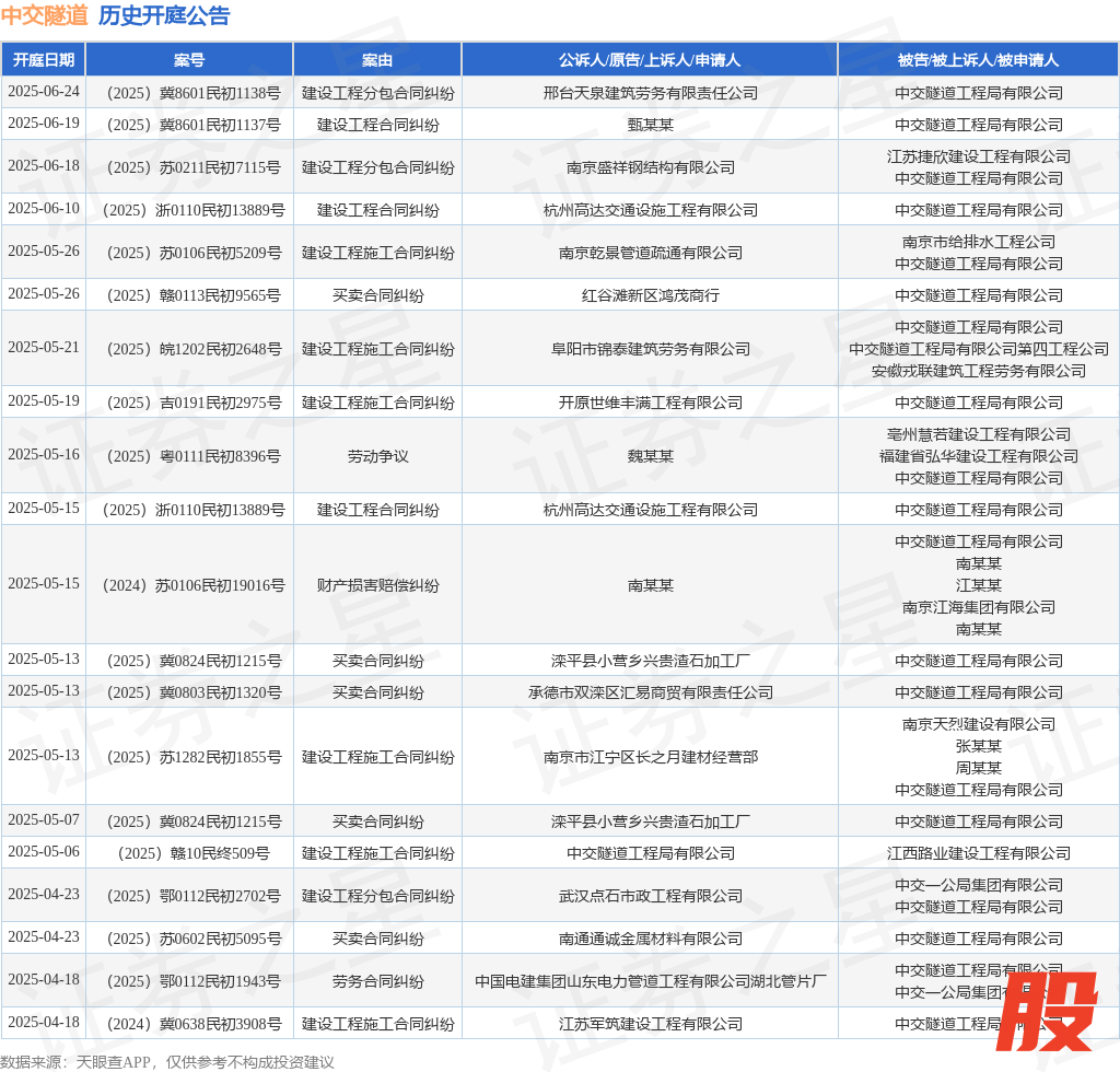 本站消息中金汇融配资,根据天眼查APP显示,近日公布了一则中交隧道工程局有限公司作为被告/被上诉人的开庭公告中金汇融配资,详细内容如下: