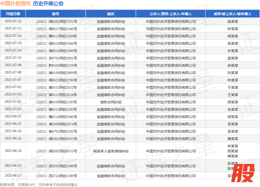 案号:(2025)冀1023民初3236号审理法院:永清县人民法院案由:金融借款合同纠纷当事人信息: 原告/上诉人:中国对外经济贸易信托有限公司 被告/被上诉人:龚某某开庭日期:2025年6月19日根据统计,近一年内以中国对外经济贸易信托有限公司为当事人的历史开庭公告有1039则,其中案由为“金融借款合同纠纷”的公告以817则居首,其次为“借款合同纠纷”有142则,“案外人执行异议之诉”有15则。历史开庭公告(前20条)如下: